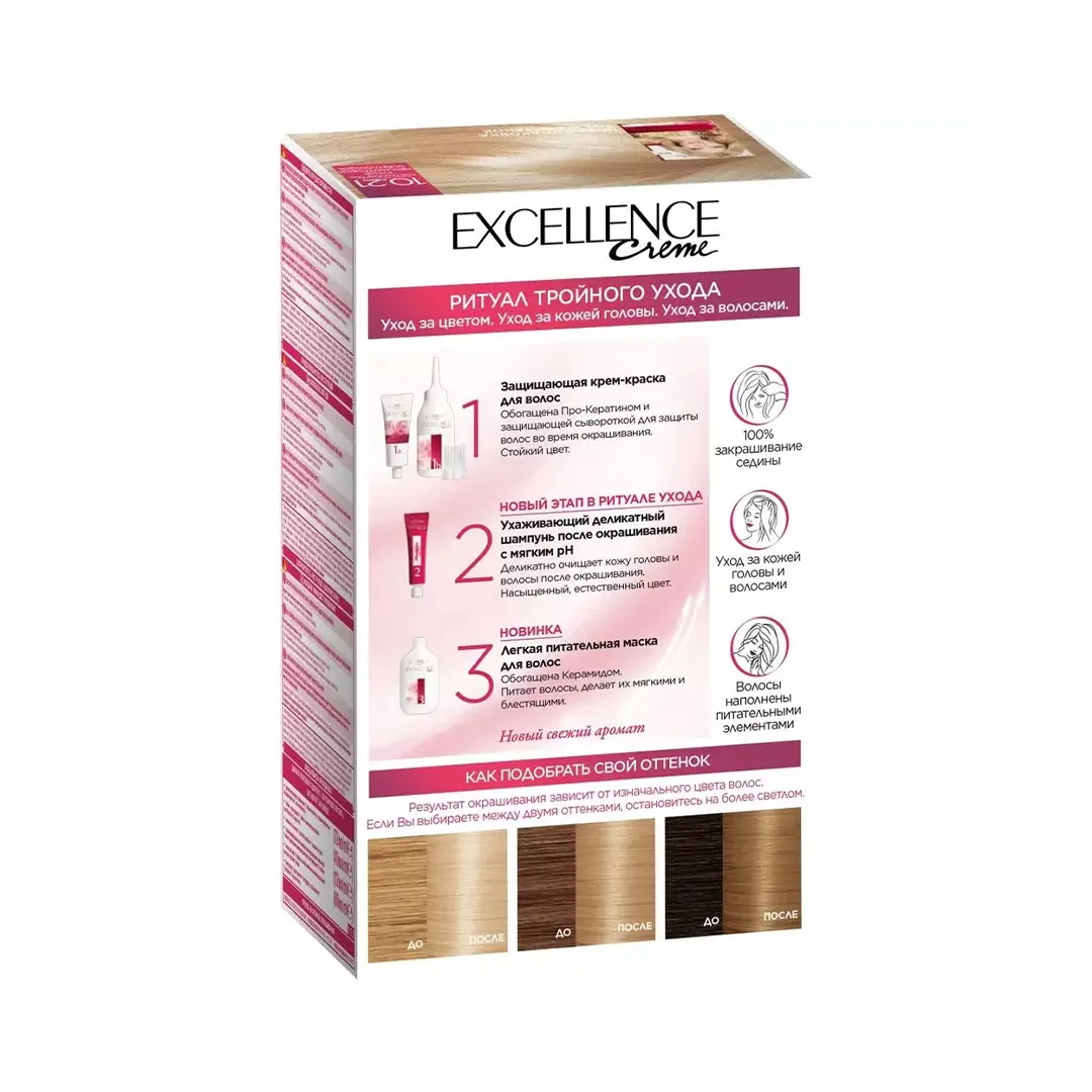 رنگ مو لورآل EXCELLENCE به لطف فناوری Triple Care System (مراقبت سهمرحلهای)، سلامت و زیبایی مو را در تمام مراحل رنگ کردن تضمین میکند: