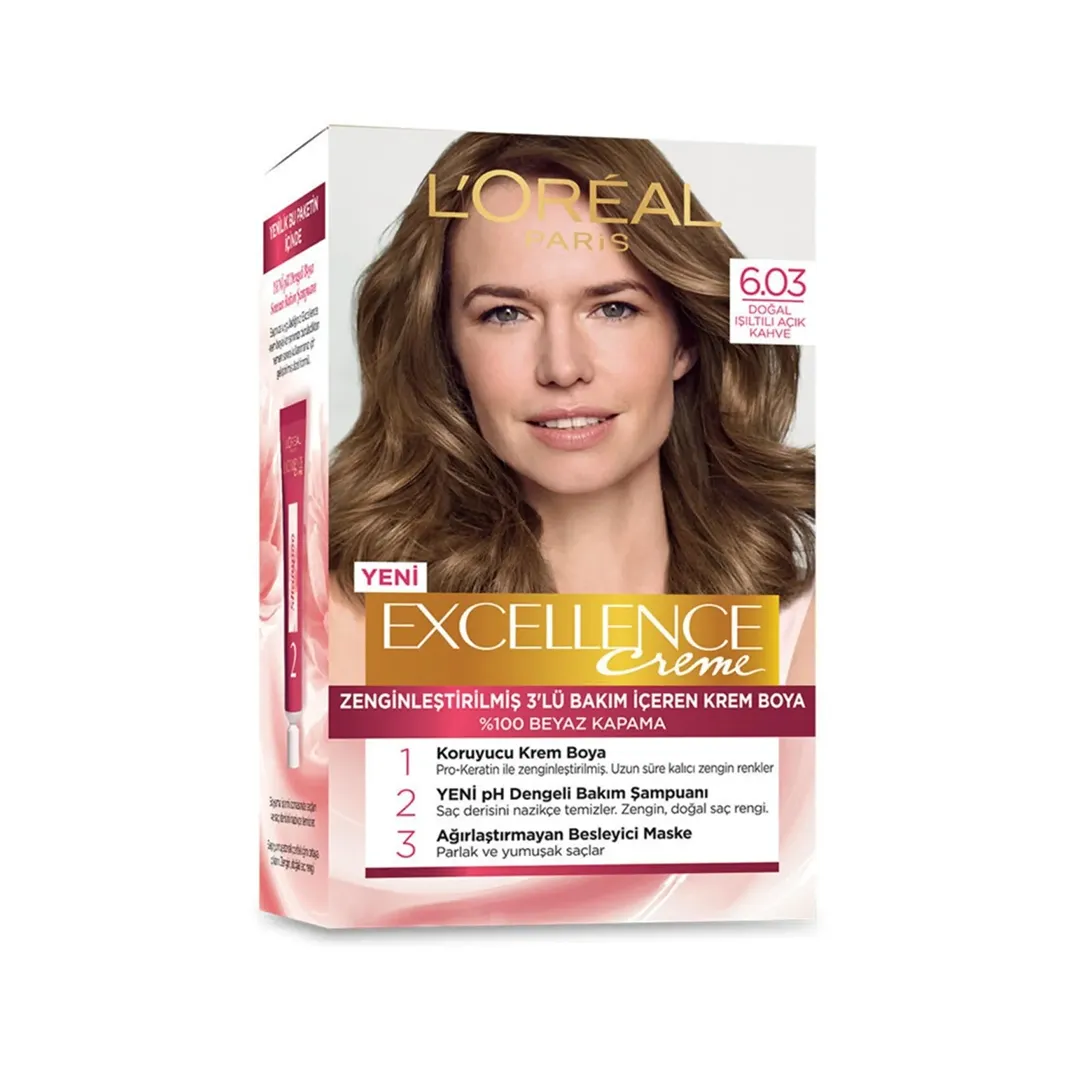 رنگ مو لورآل سری EXCELLENCE شماره ۶.۰۳، رنگی قهوه‌ای روشن گرم است که به شما رنگی طبیعی، زیبا و شاداب می‌دهد. این رنگ مو مناسب کسانی است که به دنبال رنگی ملایم و در عین حال گرم و باطراوت برای موهای خود هستند. علاوه بر رنگ‌دهی عالی، این محصول با فرمولاسیونی پیشرفته به تقویت و مراقبت از موهای شما پرداخته و از آسیب‌های رنگ کردن جلوگیری می‌کند.
