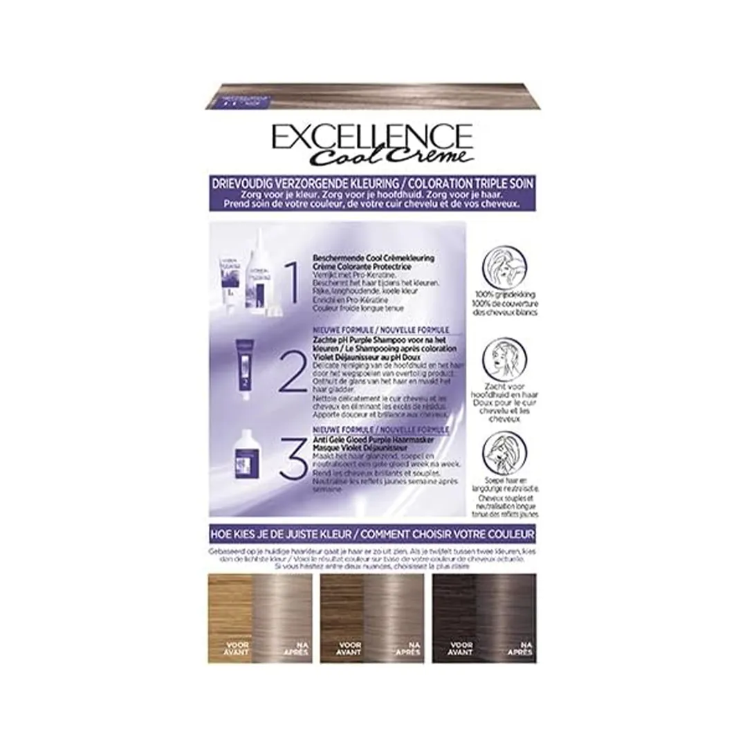 رنگ مو لورآل سری EXCELLENCE به‌طور کامل موهای سفید را پوشش می‌دهد و رنگی یکنواخت و طبیعی ایجاد می‌کند.