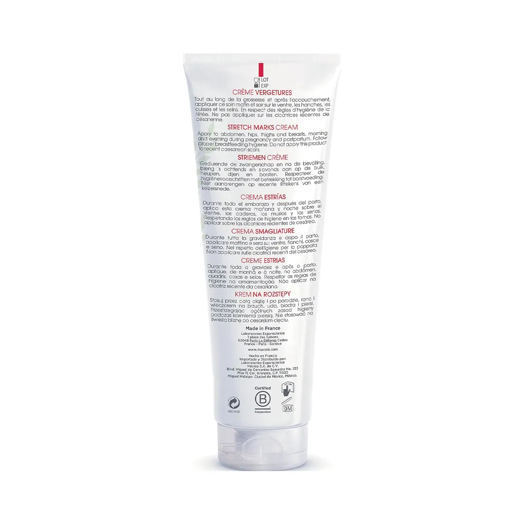 کرم ضد ترک بارداری ۳ در ۱ Mustela برای استفاده بر روی نواحی مستعد ترک پوست مانند شکم، سینه، ران‌ها، باسن و پهلوها طراحی شده است. این محصول قابل استفاده در دوران بارداری (از ماه اول) و پس از آن نیز می‌باشد. بافت آن غنی اما جذب‌پذیر است و طراحی شده تا اثرات کشش پوست را کاهش دهد، پوست را مرطوب نگه دارد و عملکرد الاستیک آن را افزایش دهد.